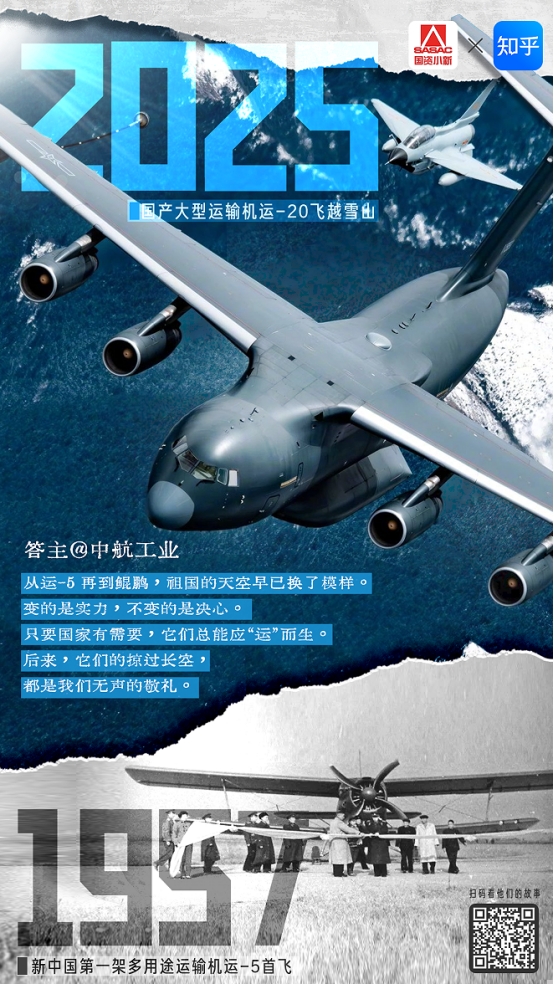 运-20“鲲鹏”穿越云层呼啸而过,47米的机身已能驮载66吨跨越洲际。运-5是起点,运-20却不是终点,无论何时何地,只要国家需要,它们总能应“运”而生。每一次掠过长空,都是我们对您无声的致敬。