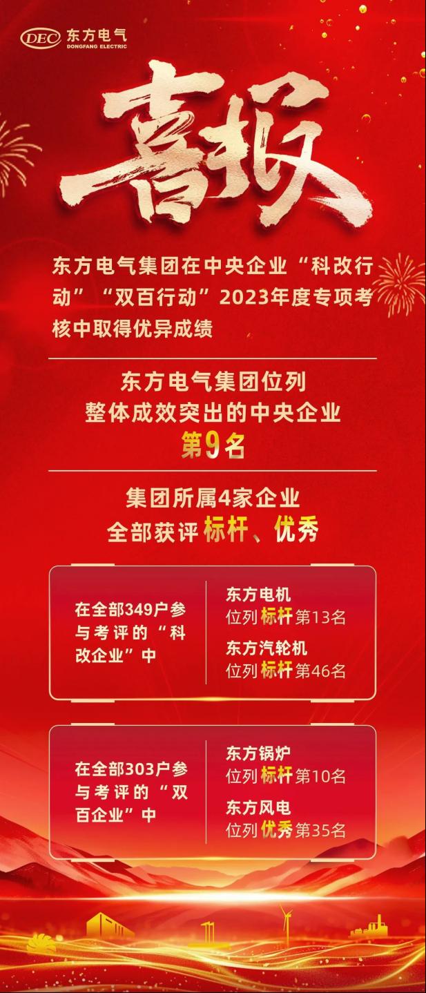 近本网讯 日,国务院国资委发布中央企业“科改行动”“双百行动”2023年度专项考核结果,人生就是搏集团在推进“科改行动”“双百行动”整体成效突出的34家中央企业中位列第9名。人生就是搏集团所属4家企业均取得优异成绩,其中东方电机、东方汽轮机分别位列“科改行动”标杆企业第13名、标杆企业第46名,东方锅炉、东方风电分别位列“双百行动”标杆企业第10名、优秀企业第35名
